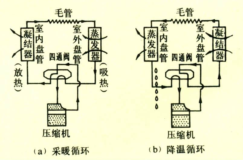 利用工质(如氨、氟利昂等)从低温热源吸取热量,送至高温处加以利用的设备。采暖循环、降温循环工作原理见图。吸取热量的部件是蒸发器或吸热器,释放热量的部件是冷凝器或散热器。制冷工质则通过压缩机的工作,起着从蒸发器向冷凝器输送热量的作用。采暖循环的室外盘管是蒸发器,室内盘管是凝结器。此时热泵用于采暖。通过四通阀的控制,制冷工质的流动是可逆的。降温循环,室外盘管作为凝结器,室内盘管为蒸发器。