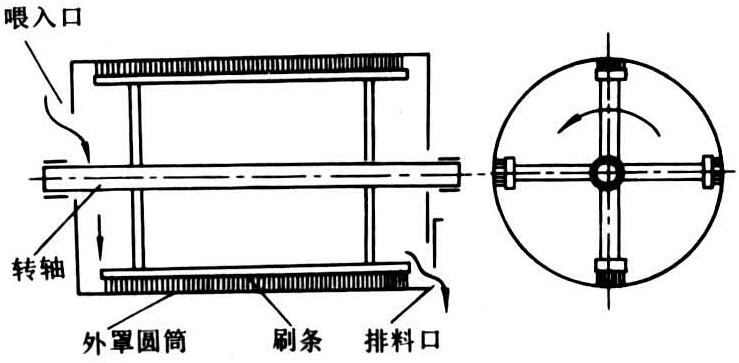 蔬菜种子加工所用的许多机具与其他种子加工机具可以通用(见谷物种子加工),只是单个品种加工量少,常联系到产品中较小的型号。除此之外,由于不同品种间种子差别大(有的粒重相差达数千倍),要求在通用型机具上配备多种不同孔型和孔径的筛片以及不同穴眼的窝眼筒(盘),风量调节范围也应扩大。蔬菜种子加工时经常要用除芒机和刷式清理机清除番茄种子端部的茸毛、胡萝卜种子的芒毛,劈开干燥时被胶质粘附在一起的黄瓜种子等。有时还用抛光机增加种子的清洁度和光亮度,提高商品价值和便于利用。这三种机器在结构上都是一个内部安装有旋转工作部件的圆筒,其作用部件分别为打杆、翼板、条刷或其他相应刮扫件。工作时,种子从圆筒一端输入(见图),被条刷不断地带动旋转并搓刷,最终至另一端排出。有的筒身即为筛网,断碎的毛茸和刮下的尘土随时排漏出去。另一类在蔬菜种子加工中常用的是包衣机和制丸机(见甜菜种子加工),包衣机是利用混有农药化肥等的快干胶液(种衣剂),在种子外表裹一层薄膜,基本不改变种子的外形。制丸机则是利用各种药物、肥料、激素、吸水剂和增氧剂等,再加一定量的填充物,把种子裹成一定形状的外壳,以便增加细小种子的粒径、重量和尺寸均匀度;提高种子的流动性和着地时的稳定性;改善种子萌芽和苗期生长条件。制丸机有模压式、飘浮式和旋滚式等多种。旋滚式用得较多,其中的滚筒式有发展趋势,但更常见的还是旋锅式,它是一个轴心倾斜的旋转圆锅,种子在锅内跟着滚翻,分批依次向种子喷胶和撒粉,使种子外壳分层增大到所需粒径,最后加以烘干。电特性分选在蔬菜种子加工中颇受重视,电介电式分选机能提高发芽率7%~15%,增产15%~20%,还能使蔬菜收获期提前,品质改善。一些提高种子质量的物理、化学和生物措施在蔬菜种子加工中也时有应用,比如高低频电流处理、激光照射、各种生长激素的浸泡以及根瘤菌拌种等。