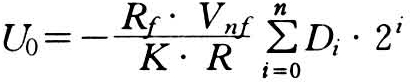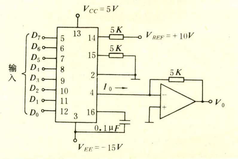 式中 Rf为运算放大器的反馈电阻;Vnf为基准电压;R为最低位的权电阻;K为常数,采用权电阻网络时为2n+1。由上式可见,输出电压U0(模拟量)与输入二进制数Di(数字量)成正比,实现数字量与模拟量的转换。在集成电路的数/模转换器中普遍采用变形权电阻网络,使网络中电阻阻值变化小,提高转换精度。数/模转换集成片的输入端有8位、10位、12位和16位等,如DAC0808是8位的数/模转换器,输入数字量为8位二进制数,它不包括运算放大器,应用时需外接运算放大器(见图)。
