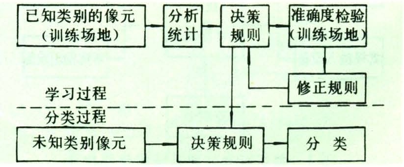 根据人事先指定的已知训练场地提供的样本,通过选择光谱特征参数、建立判别函数来对未知类别的像元进行分类处理。计算机对训练场地内的已知像元的光谱特征进行分析统计,提炼出这些类别的光谱特征参数或建立相应的判别函数,作为区分其余未知类别的像元的依据。利用训练场地的已知像元训练计算机或估计参数,从而形成判别函数的过程,是监督分类的学习过程;利用判别函数对未知类别的像元进行识别分类的过程,称为监督分类的识别分类过程。这两个过程的关系见图1。由于提供的训练场地所包含的已知像元总是少量的,未知像元总是大量的,故要求已知像元具有代表性,以保证分类结果具有足够的精度。
