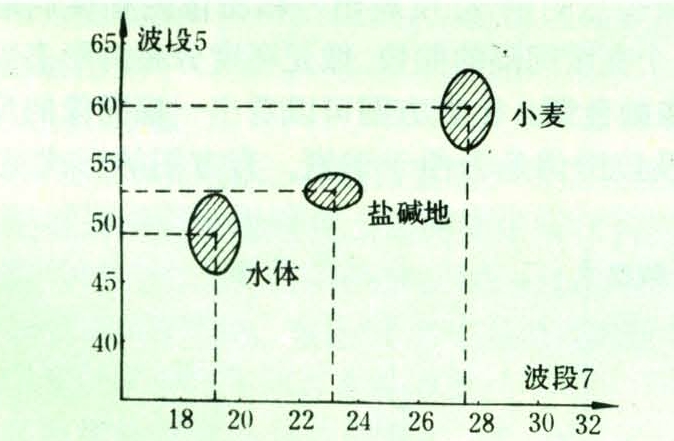 式(1)~(3)中,m i为第i个训练场地内已知像元的个数;Xij是第i个训练场地内已知像元j的光谱信息,共有n个分量,即x1、x2……xn;n是分类处理所用的谱段数;Mi及∑i表明在n个谱段的光谱信息构成的n维特征空间中,类别i的光谱分布区域的重心位置、大小和形状,反映出该类别的已知像元的光谱统计特征。图2给出小麦、水体、盐碱地在由陆地卫星5、7两个谱段构成的二维空间中的光谱特征椭圆体。椭圆体越小,该类像元的光谱取值范围越集中,反之越离散。根据公式