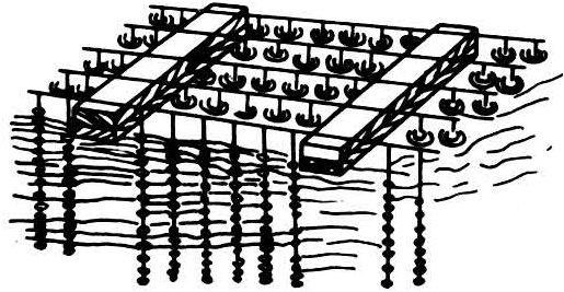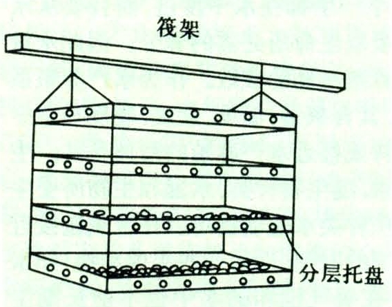 为了实施水生生物环境因子的调控,必须建设各种水产养殖工程系统,主要有:①天然水体养殖系统。系统的水体处于自然状态,如海滩、湖域的水体。在天然水体中的养殖,一般采用垂养和网箱养殖两种方法。垂养是利用垂直水域立体养殖生物,如养殖牡蛎、珍珠蚌和贻贝等,可以大大提高单位面积产量。垂养又分为筏养(图1)、架养(图2)和盘养(图3)几种养殖方式。垂养法可增产的原因,首先是由于利用立体水域进行生产;其次是大多数垂养在其吊绳的下端至少离底30~60厘米,图2使底栖生活和爬行的许多敌害无法危害养殖生物,且使养殖生物得到各层天然水体中丰富的浮游生物。但波浪易毁坏筏架一类的垂养设施;吊绳的晃动也会破坏生物体在旧贝壳上的附着力。网箱养殖用于养殖某些鱼类(见养鱼网箱)。②半封闭系统。特点是人工控制的天然水体但不循环利用,有池塘养殖(见养鱼池塘)和流水养殖两种,可以按要求选定养殖场的位置和设施。在技术上流水养殖比池塘养殖先进,因为可以控制水的温度、流量、敌害和病害等因素。许多流水养鱼系统对用水实行过滤和净化。用过的水排放到天然水体之前,特别是在高密度养殖时,需采取减轻污染措施。③封闭系统。养殖用的水体留在系统内,用泵或其他装置加以循环利用,很少用系统外的水进行更换。系统的环境因子受到严格控制(见工厂化养鱼),与半封闭系统相比,可以更加经济地控制水温—变温生物最重要的临界温度。这种系统投资和生产费用高,管理要求严,尚未普遍推广。