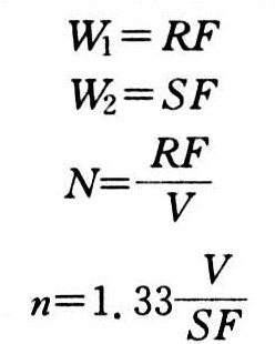 式中 W1为年来水量(立方米);W2为年来沙量(立方米);R为年径流量(立方米/公顷);S为年泥沙流失量(立方米/公顷);F为集水面积(公顷);V为水窖容积(立方米);N为水窖数量(眼);n为淤满年限(年);1.33为系数(假定水窖拦蓄来沙量的60%,水窖容积淤积80%即视为淤满)。