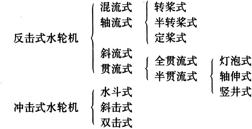 种类很多,主要区别在水的流向与转轮结构的不同。其分类如下: