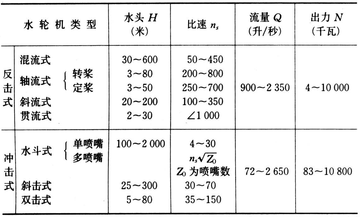 水轮机的主要参数有:①水头(米),即水轮机进、出口水位高度差。②流量Q(米3/秒),即单位时间内流经水轮机排水量。③水轮机出力N(千瓦),表示水流的能量,N=9.81QHη,式中Q为设计流量;H为平均水头;η为水轮机效率,小型水轮机在82%以下。④转速n(转/分)。⑤比速ns=,即工作水头为1米,水轮机功率为1千瓦时,水轮机的转速。