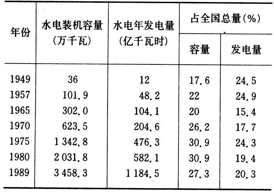 1949年中国的水力发电总装机容量为36万千瓦(未包括台湾省),年发电量12亿千瓦时,水电装机占当时全国电力总装机的17.6%,发电量占当时全国电力总发电量的24.5%。到1989年底,全国水力发电总装机达到3458.3万千瓦,年发电量1184.5亿千瓦时,装机容量仅次于美国、前苏联、加拿大、巴西、日本居世界第6位,年发电量仅次于美国、加拿大、前苏联、巴西居世界第5位。其发展过程见表2。