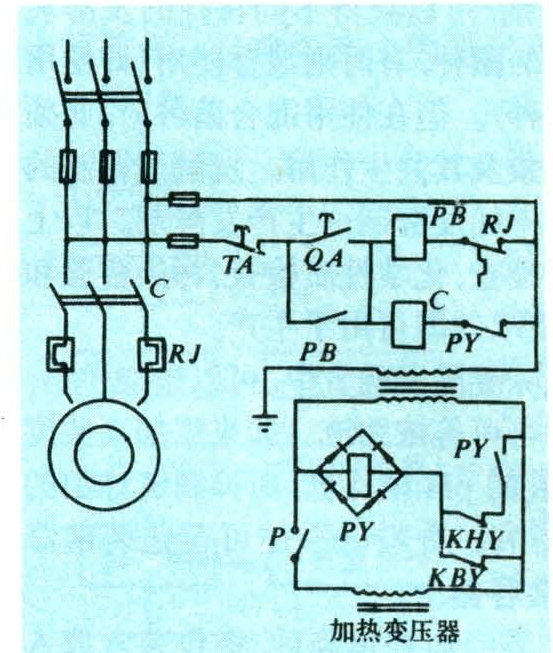 利用水塔标高所形成的压力,向管网供水的设施。该系统由水源、自动电泵站、供水管网、用水设备等组成。塔式电泵站校易于实现自动化,但对自动化元件的要求可靠、稳定、且具有瞬动性能,其基本元件是装在水塔储水箱内的水位传感器。水位传感器有浮子式及极板式两种,以极板式(图1)较为理想。所用电极板为250×250平方毫米的两块钢板,厚约2~3毫米,极板间距为10毫米,其中一块直接焊在钢管上,另一块固定在绝缘套管上。极板共两对,其间保持一定距离,分别与储水箱的上、下水位相对应。极板式水位传感器在储水箱中安装的尺寸如图2。在控制电路(图3)中KBY为上极板,KHY为下极板,当上、下极板全部露出水面时,电机水泵机组启动向水塔储水箱输水;当储水箱水满,极板全部浸没水中,电机停止,输水亦停止。在冬季为防止上极板的极板间隙被冰冻结,破坏自动工作,需加装一台加热变压器,以上极板间隙中的水为负载,闭合线路中的开关P,即开始加热融冰,冰融后工作恢复正常。