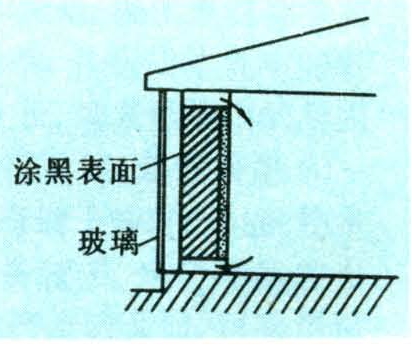 被动式太阳房一般不需要建筑物以外的设备和其他能源,仅依靠合理的建筑方位和通过窗、墙、屋顶等建筑物的本身构件,吸收、贮存太阳能。结构简单,造价低廉,管理使用方便。又可分为:①直接受益式。太阳光穿过玻璃直接进入被加热空间,在吸收表面上蓄积热量,并扩散至室内各个部分。设计简单,用材广泛,但室温波动较大。②间接受益式。利用垂直的南墙作为集热蓄热墙,进行太阳能自然采暖。这种墙由法国费利克斯·特朗勃(FelixTrombe)首创,所以又称为特朗勃墙。南墙外表面涂黑,上、下开有空气自然循环孔,离墙10厘米左右的外面安装玻璃窗,当窗和墙之间夹层内的空气被阳光加热后,与室内空气形成自然循环向室内供热(见图)。
