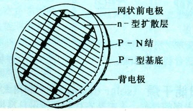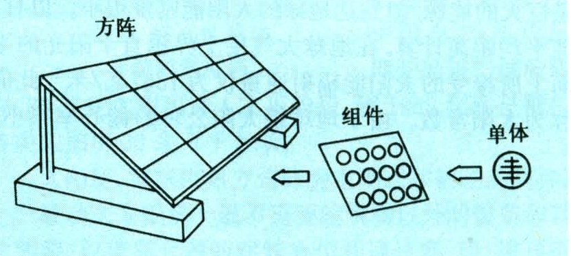 太阳电池是将光能直接转换成电能的半导体器件。当光照在太阳电池前表面时,注入电池的光子在电池内部激发出许多自由电子和空穴,这些电子和空穴由于P—N结的内势垒作用而被分离,就在电池内部产生了光电压,当接通外电路时,就会有电流流过。太阳电池单体是光电转换的最小单元(图1),尺寸一般为4平方厘米到100平方厘米。标准状态下单体电池的工作电压约为0.45~0.5伏,短路交流密度约为20~25毫安/厘米2,一般不能单独作为电源使用。将单体电池进行串、并联,并封装后就成为太阳电池组件,功率一般为几瓦到几十瓦,是可以单独作为电源使用的最小单元。将太阳电池组件串、并联,并装在支架上就构成了太阳电池方阵,它具有满足用户要求的输出功率(图2)。