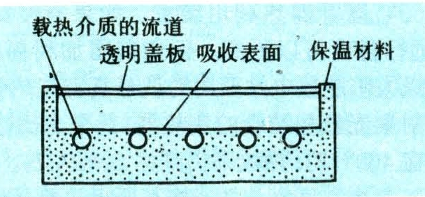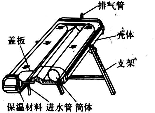 利用太阳辐射将水加热、贮存并送至用户的装置,又称太阳能热水系统。热水器由集热器、贮水箱及冷、热水管组成。集热器是吸收太阳辐射并向热媒传递热量的部件。按集热方式分为平板型及聚光型;按构造分为真空管式、热管式及蜂窝式。太阳能热水器属低温范围,集热器多为平板型,向阳面设透明盖板,背后衬垫隔热材料(图1),涂黑表面吸收通过透明盖板的太阳辐射,温度升高