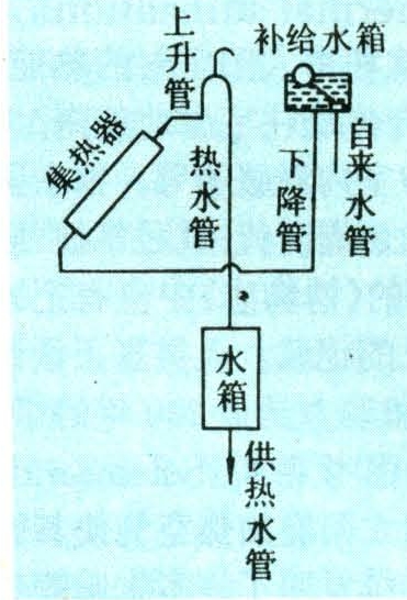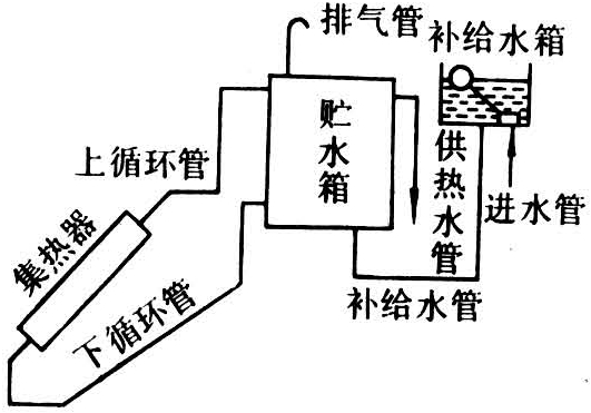 太阳能热水器按水流动方式分为循环式、直流式及整体式。循环式又分为自然循环式及强制循环式。图2是自然循环式的一种,集热器吸收太阳辐射,水温高于贮水箱中水温,二者间密度差形成热虹吸压头而对流循环。自然循环式结构简单,运行可靠,贮水箱底需高于集热器顶0.3~0.5米。在室外需保温,且需考虑建筑布置及屋顶荷重等问题。强制循环式靠泵使水在集热器和贮水箱间循环,当集热器出口水温大于贮水箱一定温度时,由系统自动控制装置启动水泵运行。