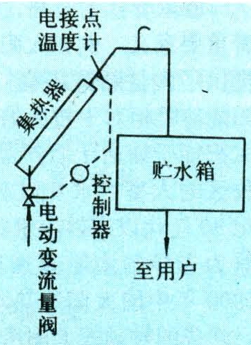 直流式分为定温放水型及热虹吸型。图3中集热器出口装有按热水要求调整好温度值的电接点温度计,它通过控制器操纵电动变流量阀开、闭或改变流量,使出口水温始终保持在设定值。图4中补水箱水位与集热器出口上升管最高位置一致。集热器吸收太阳辐射、水温升高,形成热虹吸压头,热水经上升管流入贮水箱,冷水自动经下降管补入。