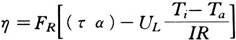 式中 η为集热器的瞬时热效率(%);FR为热转移系数;τ为盖板的透过率(%);α为吸热板的吸收率;UL为集热器的热损系数(瓦/米2·℃);Ti为进水温度(℃);Ta为大气温度(℃);I为太阳辐射强度(瓦/米2);R为集热器相对于地面的几何系数。
