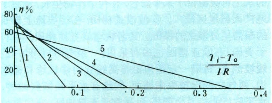 公式中的FR、τ、α、和UL近似常数,而I、Ti和Ta则是变化的,因而上式可用近似直线表示,称为集热性的特性曲线。图6是5种不同结构热水器的特性曲线。曲线1是一种无盖面的集热器,斜率很大,仅适用于夏季,尤其适合加热游泳池水。曲线2是有一层玻璃盖面,吸热板采用一般黑漆的集热器,它适合在5~10月间生活用热水。曲线3是有一层玻璃盖面,吸热板采用选择性涂料的集热器,适合于生活用热水,但时间可更长一些。曲线4是有二层玻璃盖面,吸热板采用选择性涂料的集热器,它适用于寒冷地区。曲线5是一种真空管集热器,在冬季也能使用。