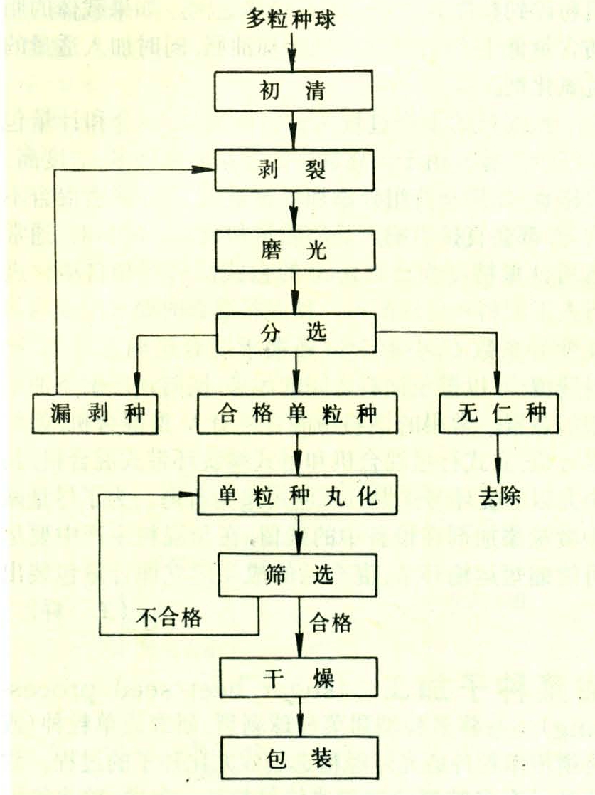 将多粒型甜菜种球剥裂、研磨成单粒种(或将遗传单粒种磨光),经精选制成丸化种子的过程。甜菜种子有多粒型种球和遗传单粒种。美国、瑞典等国使用遗传单粒种。中国已开始选育遗传单粒种,但多数仍是多粒型种球。用多粒型种球直接播种,一个种球长出1~5株幼苗,出苗后根系交错,不易间苗,耗用大量种子,需将多粒型种球剥裂成单粒种,磨光,以适应机械精密点播。磨光后的单粒种可直接当种用或经丸化后播种。甜菜种子加工工艺流程见图1。