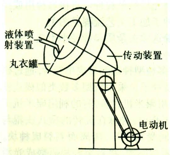 在单粒种外表面裹以杀虫剂、杀菌剂、生长素、肥料等化学药剂,以改善种子综合品质,使种子外形加大,并规范化,便于精密播种。经丸化的种子要求粒径一致;承受压力为300~500克;吸水快,投入水中2~3分钟,外壳裂开,中层丸衣能够吸水并渗入内层;干燥后的丸化种子含水率为8%左右;发芽率高(室内发芽率必须达90%以上,田间发芽率75%以上)。种子丸化机型式较多,旋转式种子丸化机(图2)应用较广泛,由倾斜安装的丸衣罐、液体喷射装置、传动和动力等部分组成。工作时,将种子放入丸衣罐内,分批定量投入丸化粉料和喷射粘结剂水溶液,丸衣罐旋转时种子周而复始在丸衣罐内不断滚动,逐渐被丸化剂包裹成丸粒化种子。最后烘干、分选、着色、定量、包装。