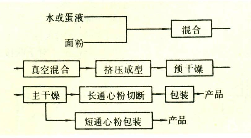 通心粉生产的工艺流程,见图示。它是将面粉与定量的水(或蛋液),有的还加入洋葱、芹菜、蒜、月桂、番茄等蔬菜干粉以及大豆粉、牛乳等以增加通心粉的品质和风味,在混合机中充分混合后,将湿面团放进真空度为600~700毫米汞柱的混合器中减压,排除包含在面团内的空气,以增加成品的透明度和耐煮性。然后送入压强为1000~2000千帕的螺旋式挤压机中,向模板一端推送挤压,强迫面团通过模孔成为各种形状的、潮湿的通心面。再送入烘房中进行脱水干燥。干燥工艺分预干燥与主干燥,前者处理时间较短,目的是使通心粉的表面略微干燥,防止互相粘结,后者处理时间较长,以烘干到水分为10%~20%,合格为止。