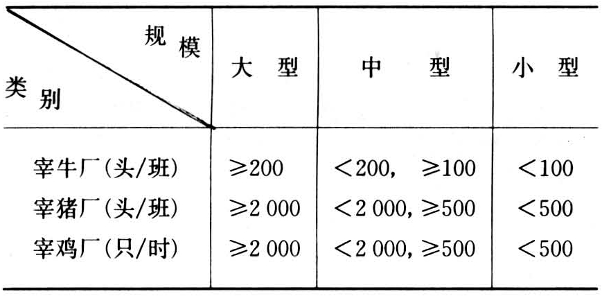 按屠宰畜禽种类可分为宰牛、羊厂、宰猪厂、宰鸡(家禽)厂。中国按生产规模可分为大、中、小三种(见表)。大、中型宰牛、猪厂屠宰工艺一般是流水作业,实现机械化操作。主要设备有输送轨道、麻电机、烫猪槽、刮毛机、剥皮机、电锯等。小型宰牛、猪厂的设备一般较简单,以手工作业为主。大型宰鸡厂在电麻、宰杀、热烫、脱羽、取内脏、冷却等一系列作业基本上实现机械化。中型宰鸡厂部分作业采用机械化。小型宰鸡厂主要是手工操作。