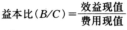 益本比(B/C)法:主要反映投资项目效益现值与费用现值的累计数之比。当比率大于1时,收益大于费用,有利,该项目可行;小于1,无利,不可行。