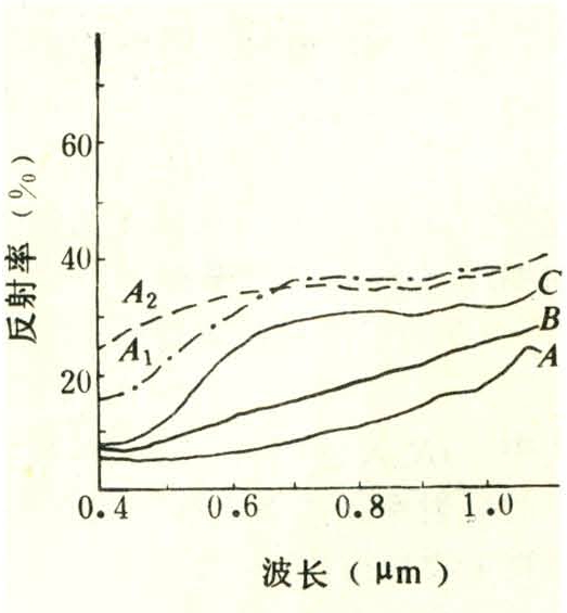土壤光谱反射率随有机物含量的增大而减小。有机物对土壤光谱反射率表现在0.55~1.0微米谱段范围内。图2中的A、B、C三条曲线分别代表了有机物含量不等的三种土壤光谱反射率曲线。曲线A1是有机物含量最高的土壤(即曲线A)脱去有机物以后的光谱反射曲线。从0.55微米开始,反射率明显增大。土壤中铁化合物的含量对光谱反射率的影响主要表现在0.40~0.54微米谱段范围内。铁化合物降低了土壤的光谱反射率。图2中的曲线A2是曲线A脱铁处理后的光谱反射曲线,0.40~0.54微米的反射率明显增大。