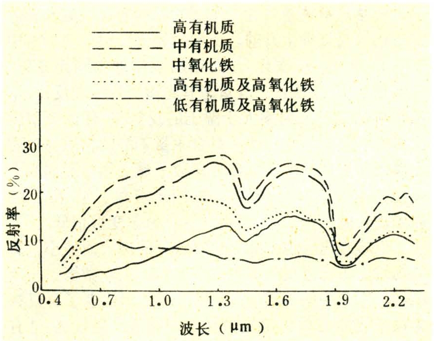 土壤的反射率在可见光和近红外谱段是逐渐上升的。土壤的光谱反射率随土壤中的有机物、水分、铁化合物、结构或质地不同而变化。一般情况下,土壤水分含量与其光谱反射率成反б,干燥土壤的光谱反射率大于湿土的反射率,任何类型的土壤都有这一特性。图1是含水量不等的粘质与砂质土壤的反射曲线。在近红外谱段干燥土壤与湿润的土壤反射率的差异更为明显,湿润土壤在1.45和1.95微米波长的两个水分强吸收处,反射率变得很低。