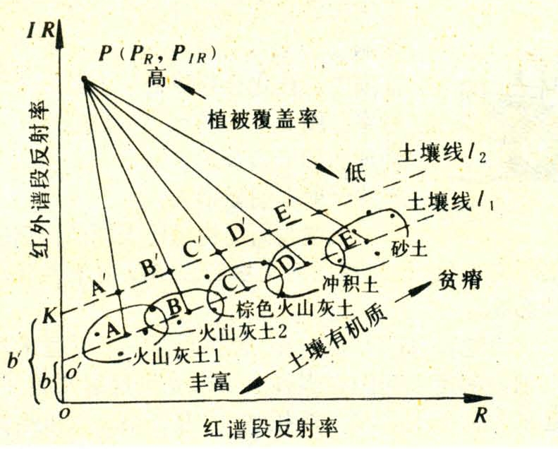 由于地面总是被植被或其他地物所覆盖,完全裸露的土壤是很少的,利用遥感技术进行土壤分类、土壤有机质含量的测定、土壤含水量的测定等研究,需在了解土壤本身波谱特性的基础上,结合土壤背景综合的波谱信息进行分析、判别,并借助其他辅助手段(如土壤线、土壤指数、谱段组合等)才能获得所需要的研究结果。同时,在研究植被的生长情况时,也必须设法排除土壤反射光的干扰。
