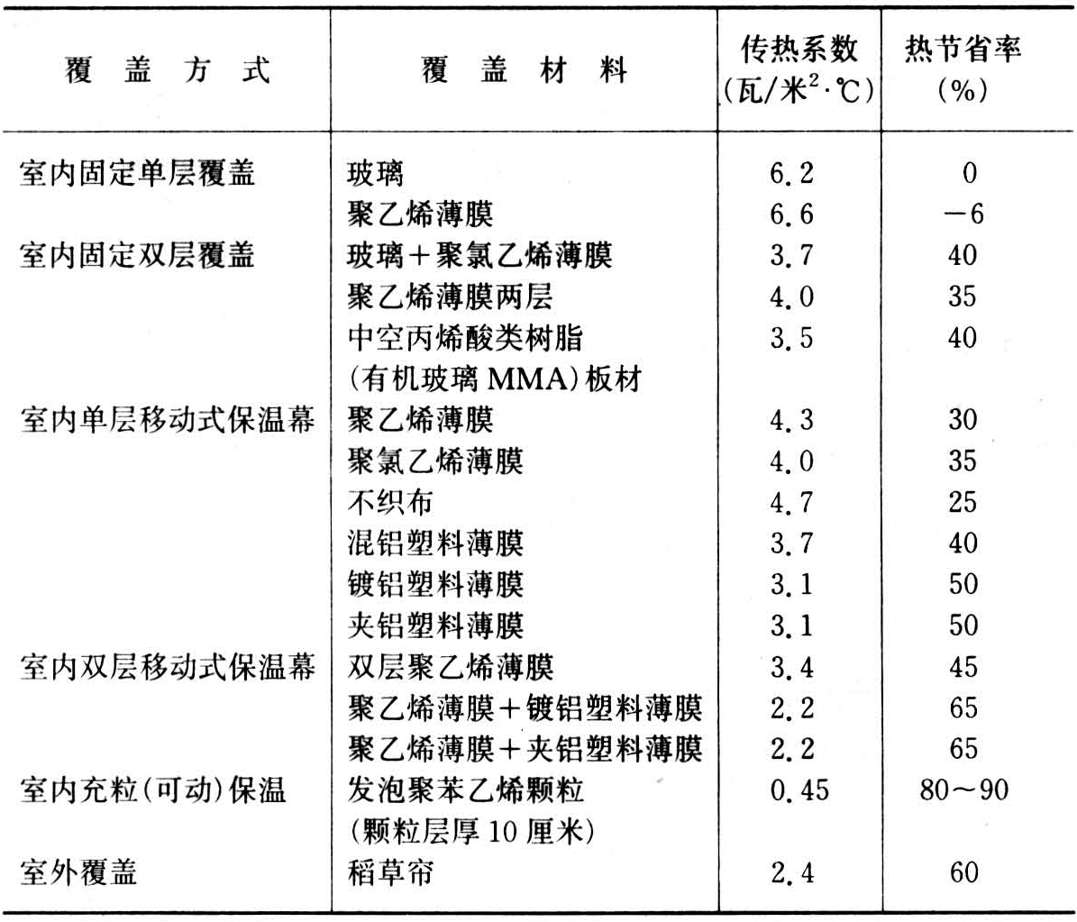为提高温室的保温能力,通常采用增加覆盖物的层次,使用保温隔热性强的覆盖材料和提高温室的密封性等手段。主要有:①在温室外侧加盖保温性强的覆盖物,如草帘、苇箔或蒲席以及纸被和棉被等。在中国普遍应用于一面坡温室。②提高温室外围护结构的保温性。应用中空腹层(二层、三层)透明有机板材、双层固定覆盖和充气、充胶双层覆盖等。充粒(发泡聚苯乙烯颗粒)温室也属于这一类,它是在玻璃温室的内侧,距屋面60~80毫米处安装一层玻璃或塑料薄膜,在夹层内夜间充以直径为5~8毫米的发泡颗粒,形成一个隔热层,用以保温。白天用风机将颗粒吸出,使阳光射入温室内,不影响植物的光合作用,可节省燃料80%~90%。在日本已用于兰花、甜瓜生产及养鱼设施的保温。③减少室内散热。在室内设置一层或两层小拱棚或活动保温幕,铺设地膜等。保温幕大多使用聚乙烯薄膜,其次为无纺布,少量为混铝、真空镀铝或夹铝塑料薄膜。一般以两层为限,保温幕层数再多,保温能力增加不多。各种保温覆盖方式的传热系数及热节省率如下表所示。