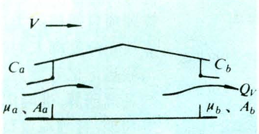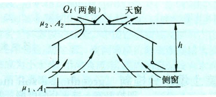式中 Qi为热压与风压使空气通过各窗孔的流量;μi为侧窗、天窗的流量系数;Ai为侧窗、天窗过流断面面积(米2);P1x为第一窗孔的余压,即在热压作用下内外空气的压差;ρ0为室外干空气密度,ρ0=(千克/米3);Ti、T0分别为室内、外空气的绝对温度(K);hi为第i个窗孔至某一共同基面(如温室地面)的垂直高差(米);g为重力加速度,g=9.81(米/秒2);△T为内外温差(℃);V为室外设计风速(米/秒2)。