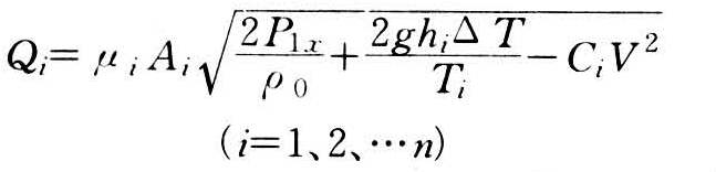 以上共n个方程,但有Q1~Qn及P1x,即n+1个未知数。为了能得到唯一解,还需加一方程,即在稳定通风下,进出气量必然相等,即Qi=0。由此求解包含n+1个方程的方程组即可求得第一窗孔余压P1x,进而可代入各式,可求得各窗孔的进气或出气量。计算结果,根号中为正值时,该窗孔为出气;根号中为负值时,应取其绝对值开方,而Qi取负值,表示该窗孔为进气。各窗孔总的进气量或出气量即为在热压与风压同时作用下多层窗的通风量。
