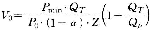 水罐容积V0由干容积Va(压缩空气所占容积)、调节容积Vr(与水塔储水箱的调节容积相当)、储备容积Vq(容积很小)及残余容积Vw(罐内水面降至最低,水不能供出时所余的容积)累计构成。水罐内空气压力的上、下限(Pmax、Pmin),分别与空气容积为Va及Va+Vr相对应,则水罐容积为: