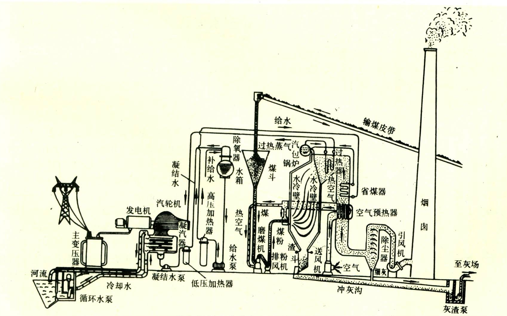 从燃料燃烧所得到的热能转换为机械能,再转换为电能的过程。原煤磨制成粉后,以预热后的热空气经喷燃器送入炉膛内燃烧,将化学能转换为热能。高温烟气在吸风机作用下,沿炉膛、烟道、过热器、省煤器、空气预热器依次流过,并逐步将其热能传递给工质和空气,变成低温烟气进入除尘器净化,最后通过吸风机及烟囱排向大气。燃烧后排出的灰渣及除尘器收集的飞灰,用水冲入灰渣沟,再由泵、管道等设备排出厂外。