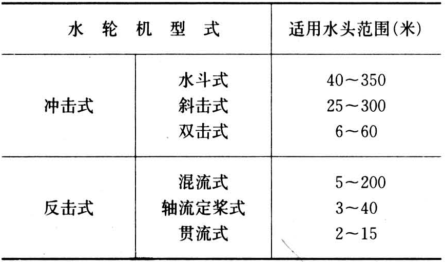小型水轮机可分为冲击式和反击式两大类。冲击式又分为水斗式、斜击式和双击式,反击式中又有混流式、轴流定桨式和贯流式之分。各种小型水轮机的一般适用水头范围如表所示。