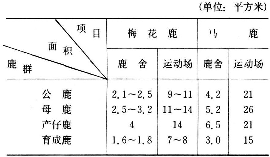 鹿舍分为公鹿舍、母鹿舍、育成鹿舍、产仔鹿舍和病鹿舍等。每种鹿舍都配置运动场。为了便于转群和放牧,舍外及运动场外都设置隔栅和通道。较大型的鹿场,一般在鹿舍内单设公鹿小圈,小圈的走廊与公鹿、母鹿舍相通,以便单公群母或单公单母配种。鹿舍与运动场的面积因鹿品种、饲养方式而异。马鹿体型大,占地面积比梅花鹿多一倍,放养的鹿群比舍饲鹿群占用面积少30%左右,舍饲鹿群的每头鹿平均占用面积见表。通常在运动场内设置料槽和水槽,饮水槽上部设水龙头,槽底装有排水栓,以便刷洗后放水。料槽和水槽有木制、石制和铁制三种。此外,鹿圈中也备有一定量的盐槽。在公鹿舍附近一般都设置保定设备(通常称为吊圈或夹圈)。它是锯茸、助产、预防注射、治疗疾病、装运鹿只的通用设备,由1~2个小圈、保定器和连接两者的通道三部分构成。每个小圈是存放待锯茸公鹿的地方。保定器是保定鹿的特殊器具,有半自动夹板式、抬杆式和吊索式三种。