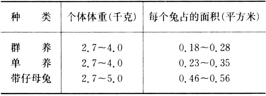 兔舍一般为单层建筑,其建筑形式常依兔场的规模、生产工艺和建场地区条件而定。有开敞、有窗、密闭三种型式。在中国高寒地区和山区也有采用地窖或山坡窖养兔,但为数不多。开敞式兔舍多建于气候温暖地区,常建成构造简陋、能遮阳、挡雨的凉棚,棚内用隔栏分成小区。有窗式兔舍夏季以自然通风为主,必要时辅以机械通风,窗户大小高低既要保证通风换气,又要防止夏季阳光直射舍内。密闭兔舍一般不开窗,温度、湿度、光照及通风等均由人工控制,能够最大限度满足兔群生长的需要。兔舍要求能防风、防雨、防潮,光线充足,空气流通,并能防止啃咬损坏,打洞逃跑以及外部兽害。舍内温度保持在5~30℃,相对湿度65%左右。室内笼养兔笼最小面积参见下表。