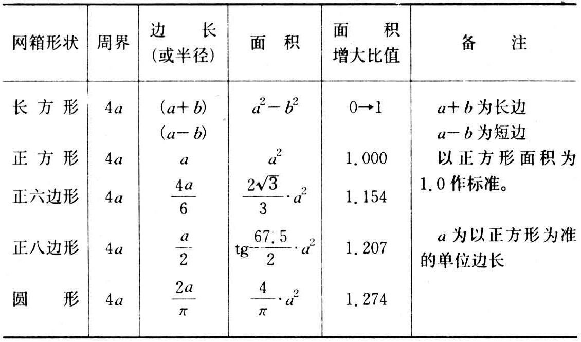 包括网箱的形状、面积、深度和网目的大小:①网箱形状。除正方形的以外,正向多边形或圆形方向发展。从理论上计算,在深度相同的情况下,多边形或圆形的网箱用材最省,但制作上正方形或长方形的网箱较为方便。在网箱深度相同的情况下,用定量网材制成的各种形状的网箱,其面积是不相同的(见表)。②网箱面积。面积较大的网箱,可以节约网衣材料,但容易引起逃鱼,网破的可能性也大,同时网箱中水体交换和鱼的放养密度都不及小网箱,产量较低,操作也不方便。面积较小的网箱虽造价较高,但具有操作方便,逃鱼概率低和产量高等特点,因此中国多数地区大多采用中小型网箱。③网箱深度。适当地增加网箱深度,可以不必多费网片材料而能增加网箱容鱼的体积,但过深的网箱容易造成网箱底部缺氧,透射入水层的阳光减弱。水体中氧气的分布是随深度的增加而递减的,但与水流、风浪、鱼群的活动也有关系。中国采用的网箱深度一般在2米左右;培养鱼种采用的网箱深度,水库为2~4米,湖泊为2~3米。④网目大小。培育鱼种的网箱网目一般为1.0~1.5厘米,但以1.2~1.3厘米为佳,加工时的允许误差为±0.1厘米。网目过小,则网孔容易被藻类和其他有机物等所堵塞,影响网箱的滤水量,对网箱内鱼种生长不利。
