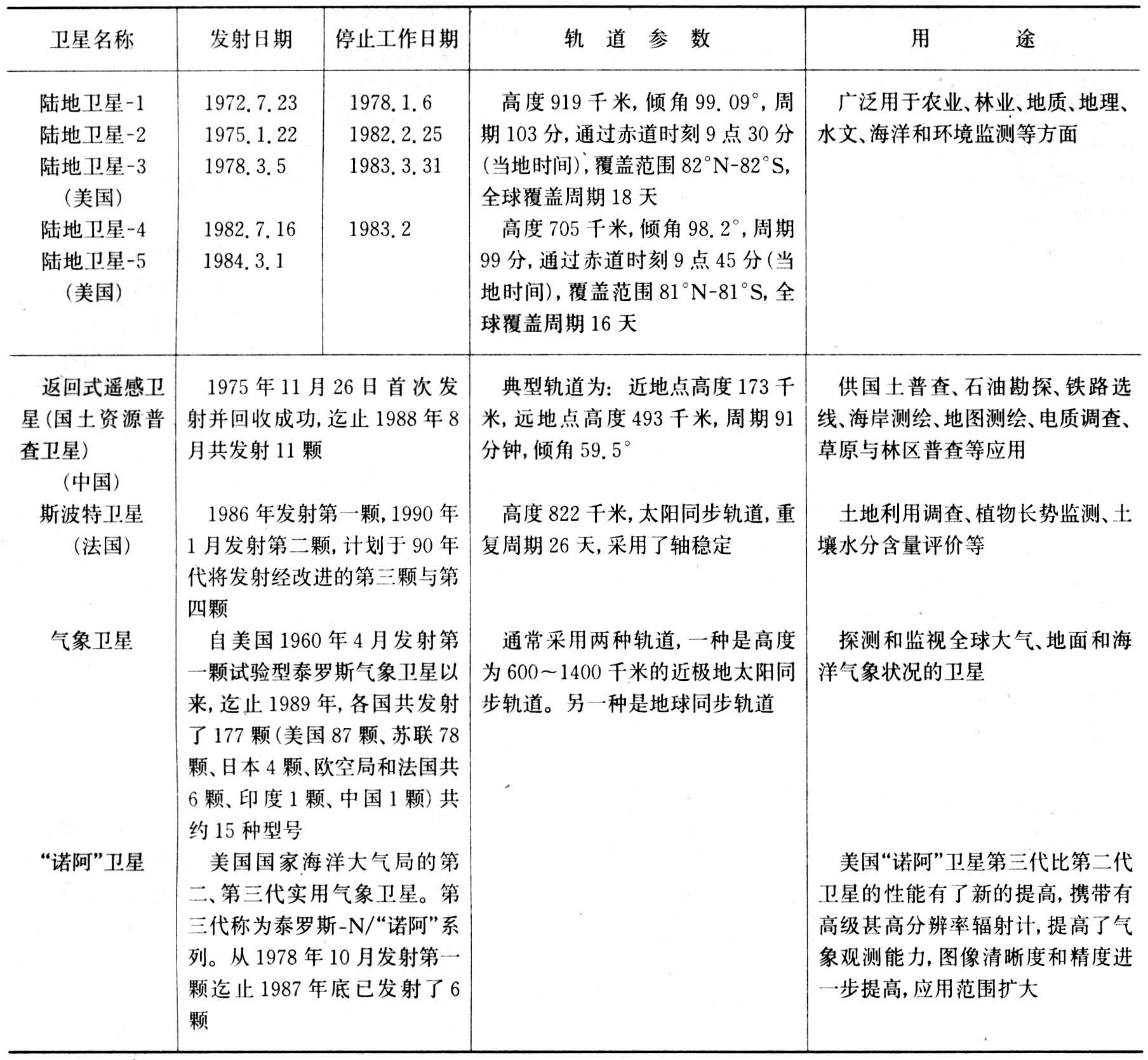 20世纪50年代第一颗人造地球卫星上天,1960年卫星回收成功,是航天遥感技术发展的基础。1961年美国的“环境遥感讨论会”和1964~1965年的“空间地理学”的研究,探讨从空间收集地面信息的方法,逐步形成以地球为目标的空间勘测规划。美国在70年代和80年代相继发射了相同类型的以勘察地球资源为目标的陆地卫星(Landsat)5颗,此外还发射了天空实验室(Skylab)和海洋卫星、气象卫星等。与此同时,苏联利用“联盟号”宇宙飞船和“礼炮号”轨道站执行了类似的地球资源勘察使命。法国为管理地球资源和环境,开展了空间测图研究,相继于1986年2月与1990年1月发射了地球观测实验卫星Spot-1与Spot-2。中国也非常重视空间技术发展,已多次发射了国土资源普查卫星和科学实验卫星并实现卫星回收。历次回收的资料,已在各有关部门开发应用。这一阶段对地球探测,除了航空遥感外,还使用了卫星(见表)、宇宙飞船和航天飞机等遥感平台;使用的遥感器除摄影机外,还有返束光导管摄像机、多谱段扫描仪、热红外扫描仪、侧视雷达等;遥感图像的地面分辨率也在不断提高,对遥感图像的分析、识别由过去的目视判读进入由计算机自动处理、解译阶段。遥感资料的应用遍及农业、林业、海洋、水利水文、石油、地质、能源、交通、考古、地理、测绘等各经济部门和学科领域。