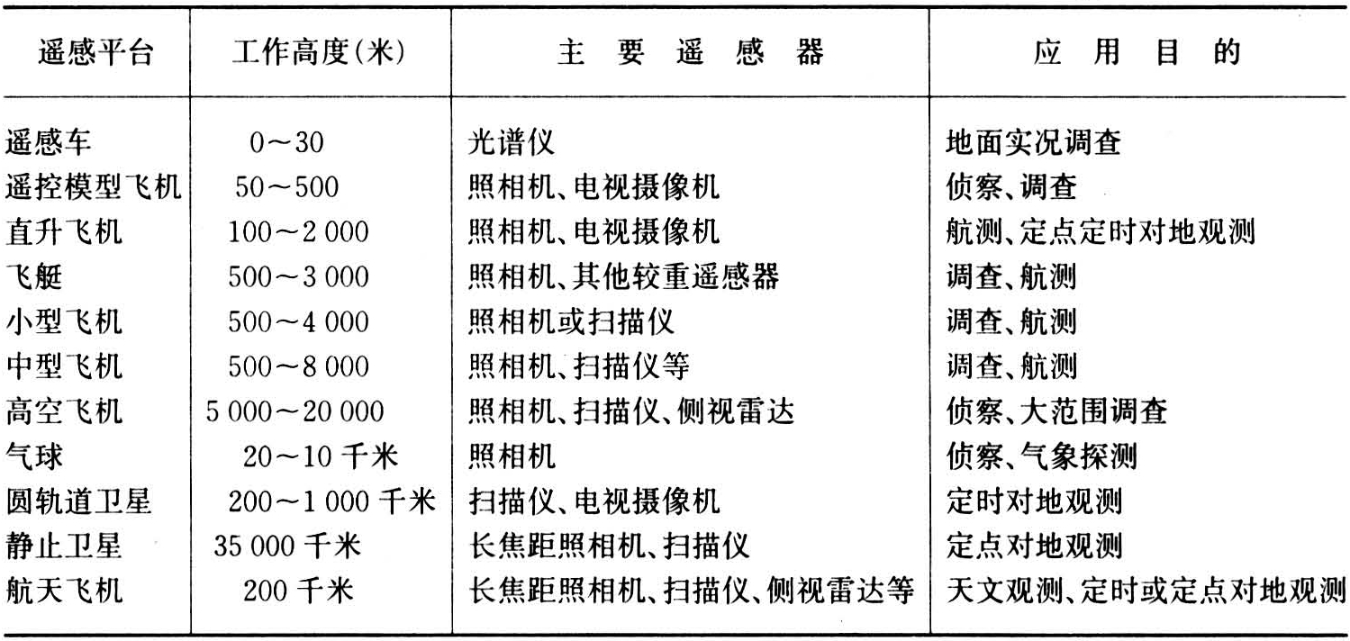 放置遥感器的运载器具。按高度,可分地面平台、空中平台和太空平台三大类。地面平台有三角架和高塔、汽车(或船)上组装的悬臂高架等,主要用于近距离测量地物波谱和摄取供试验研究用的地物细节影像;空中平台有气球、飞艇、飞机等在大气层内的各类飞行器;太空平台为大气层以上的飞行器,如卫星、宇宙飞船和探空火箭等。遥感平台还要为遥感器提供能源、温度控制、姿态控制和信息传输等手段。遥感平台因应用目的以及运载工具和主要装备的差异,可细分为多种(见下表)。