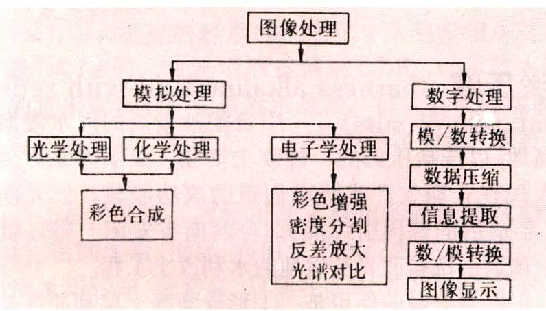 根据识别图像的先后次序,图像处理分为实时处理和事后处理两类。目前的遥感图像是用胶片或磁带记录下来的,大部分是对图像进行事后处理。根据处理的手段,遥感图像处理可分为模拟处理和数字处理两大类(见下图)。