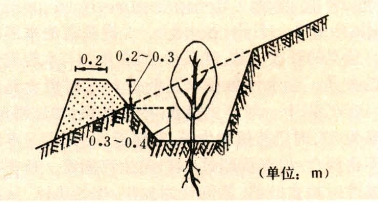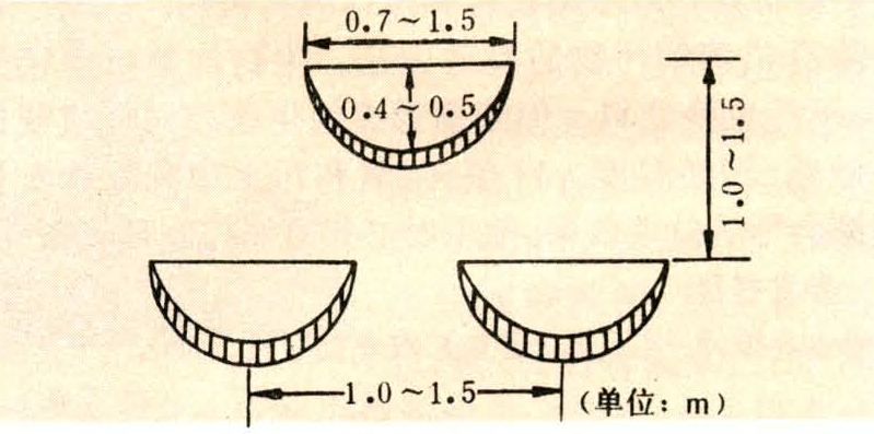 在坡地上沿等高线自上而下开挖的半月形坑穴。因坑穴在山坡上呈品字形交错排列,状似鱼磷而得名。鱼磷坑长径与山坡等高线平行,短径与等高线垂直,坑面水平或稍向内倾斜,坑外缘修筑土埂。挖坑时,一般先将表土堆于坑的上方,然后把心土刨向下方,围成弧形土埂,埂应踏实,再将表土放入坑内。鱼磷坑有一定的容水深度,蓄水较多,有较大的减弱地表径流的作用,适用于有水土流失的干旱山区丘陵及黄土高原,有一定的保持水土效能。在较陡的坡面和支离破碎的沟坡上可采用这种整地方法,与造林结合,使之形成有利的小地形,改变立地条件,蓄水保土,促进林木成长。鱼磷坑整地的一般尺寸如图1、图2所示。