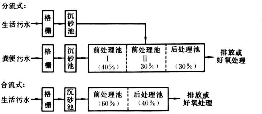 分流式的前处理池Ⅰ占总容积的40%,前处理池Ⅱ和后处理池分别占总容积的30%。合流式的前处理池占总容积的60%,后处理池占40%。总容积不小于8立方米。