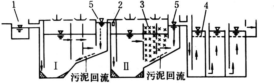 此工艺流程设有两个前处理池,池Ⅰ专门处理粪便污水,达到清浊分流。为延长粪便滞溜期,经水压间排出的清液流入池Ⅱ,其他生活污水直接流入池Ⅱ。因池Ⅱ的污水量大,故内装有醛化维纶纤维制成的软性填料,作为微生物的载体,表面积一般大于3000平方米/立方米。池Ⅰ的结构呈较深的“斗”状,水压间中安装有聚氨酯过滤泡沫板。该泡沫板的孔径为200微米左右,能使悬浮固体不溢出,沉降下的污泥可回流至“斗”中,以增加微生物数量,有利厌氧发酵,也使污水与污泥分离。后处理池为折流式污泥床,分为3~4格,每格中亦安有过滤泡沫板。污水从水向上流动,不会产生淤塞现象。后处理池与大气相通,其作用是进一步净化来自前处理池的污水。生活污水可依靠各段水位高程自动向指定方向流出,不耗能源。在有地势可利用的场所,可将后处理池的一部分容积设计成好氧滴滤池。当流出的水体对氮、磷有特殊要求时,可增设生物氧化塘,塘中种植耐肥水生植物(如水风信子等)。后处理池还可增添消毒设备,作为疾病流行时季节性消毒之用。