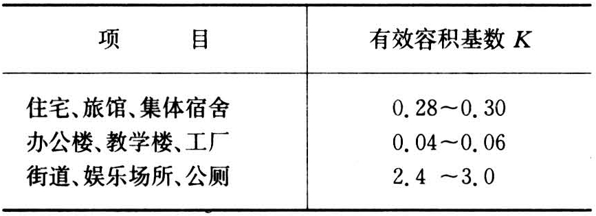 式中 V为小型生活污水净化沼气池总容积(立方米);N为实际使用人数;D为公共厕所蹲位数;K为有效容积基数,由下表给出: