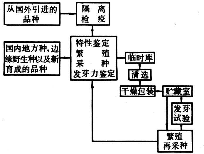 品种资源库由贮藏室和辅助用房(包括临时库、精选室、干燥间、干燥工作室、发芽室和卡片间等)组成。其平面布置,应满足种子入库前的处理工艺流程(见图),最好将辅助用房布置在贮藏室的周围,避免把贮藏室任何一面直接曝晒于烈日之下。
