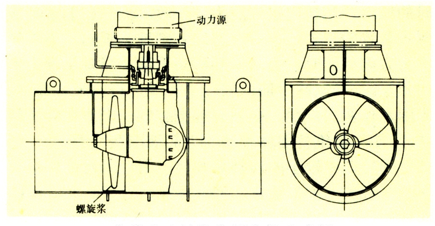 种类 主要有喷水式、舵桨式和导管桨式几种。渔船使用的主要是导管桨式。喷水式是用轴流泵通导管至水下舷侧喷水,或在船首底部开一凹坑,设置喷头,以15°~20°的俯角,可转至任何方向喷射水柱。喷头转向舷侧起侧推作用,若方向朝后,则起辅助推进作用。舵桨式是在船首或尾部设一直立圆筒,直通船底,内装一带有动力的螺旋桨,使用时沿筒伸出船底,可作360°回转。当面向船舷时产生侧向推力,面向前后时产生前进或后推力。导管桨式是有一动力传动的螺旋桨,装于船的首、尾部水线下,横向贯穿船体的圆筒中。当螺旋桨转动时,水流从导管的一侧喷射出去,产生侧向推力,通常简称侧推装置。