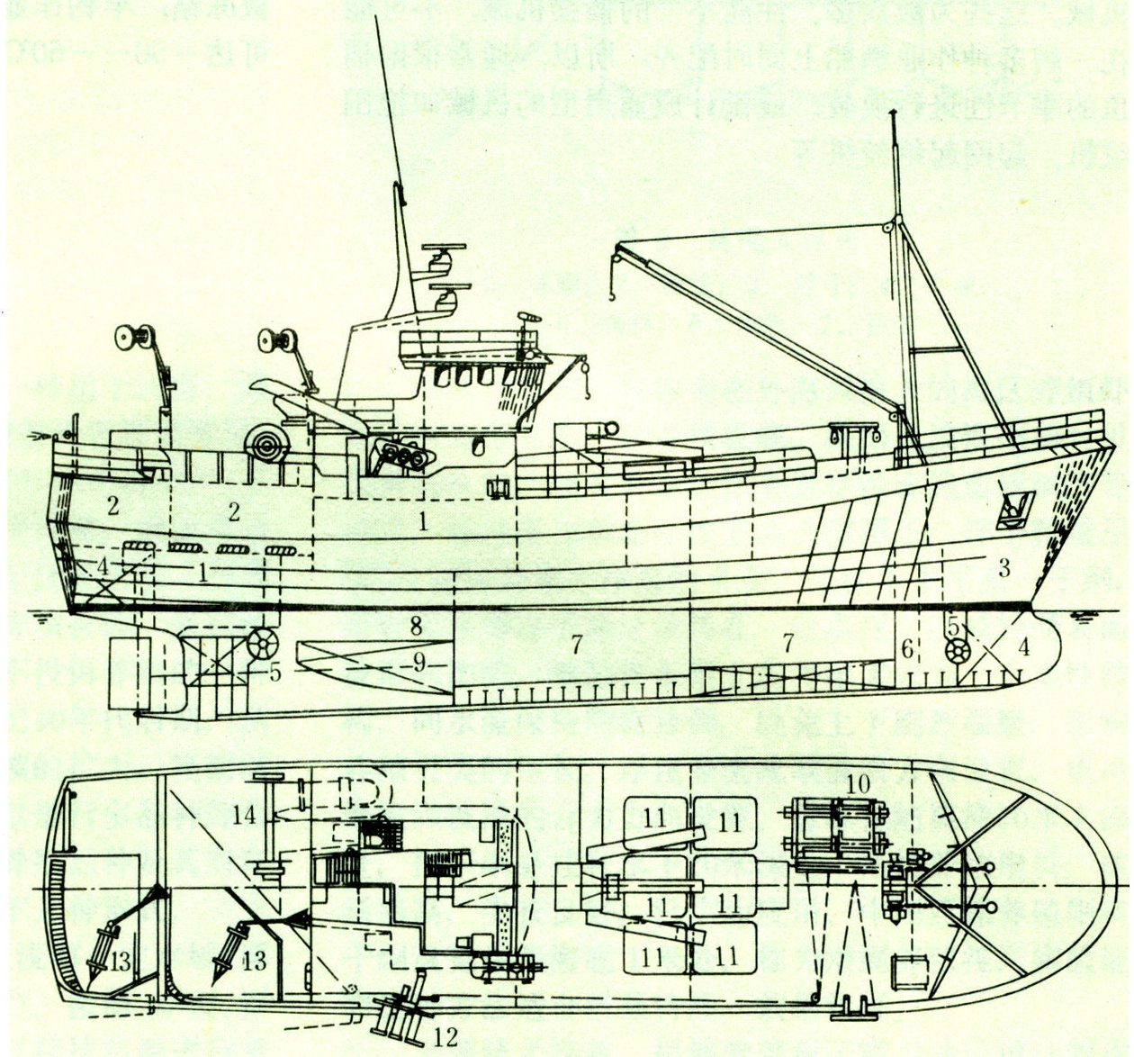 拖围兼作渔船一般船长在40米以上(见图)。通常采用尾滑道船型。尾部甲板呈不对称布置,一舷为围网网舱并深入到主甲板下,另一舷为拖网滑道(也有不设滑道),或将尾滑道在舷墙处做成水平关闭式,以形成围网网台,也可在尾滑道上方设置围网网台。这样,两种操作互不干扰。但这种布置使船的重心大大升高,不利于稳性。拖围流钓船型一般采用中、后甲板室或长尾楼,尾机型,前部用作起流、钓作业,后部用作放流、放钓作业。也有采用双甲板型式,上甲板尾部用作大型围网或尾拖作业,在作流、钓时也可用作放流、放钓,而首部二层甲板有较宽敞的面积,用以布置起流和起钓等机械装备。这种布置既解决了尾部上浪,又起到了首部遮蔽风浪的目的,而且由于二层甲板距水面较低,减少了船首运动对网具的影响。