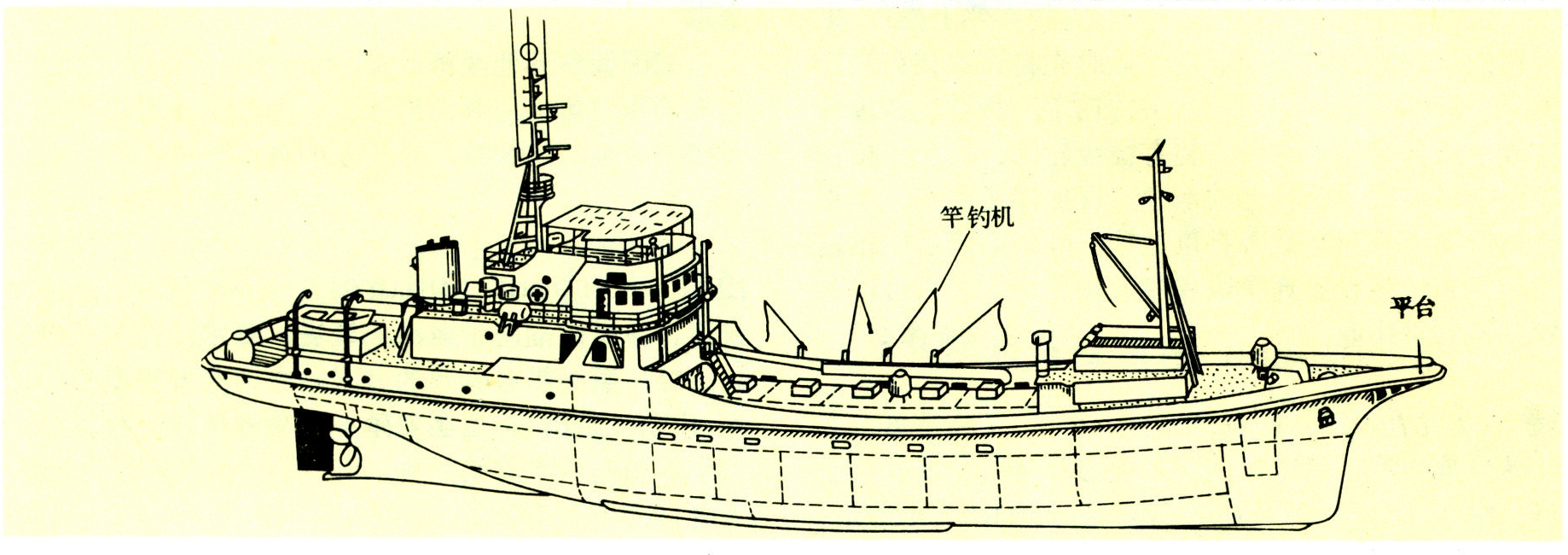 鲣竿钓最有代表性,一般沿岸作业在5总吨以下,近海作业为50~100总吨。通常都是尾机型单甲板船,鱼舱设在前甲板下面,甲板室在机舱上面。船首有一个宽敞的突伸平台作为钓鱼平台,船的四周也设有钓鱼平台,甲板上布设管系,附有能诱集鱼群的喷水装置,是一种外观很特殊的船型(见图)。船内的鱼舱,出航时作为蓄养活饵用,有渔获物后,作为盐水冻结的冻结鱼舱。活饵舱采用双层底,用海水泵强制海水循环换水。远洋作业的竿钓渔船,船体结构要坚固,耐波性和快速性要求高,因船员常在船的一舷作业,稳性要好。结构上的特点是船体中部低,首尾部高,舷弧很大,使钓上来的渔获物能很容易集中到船体的中央部。为了保持渔获物的鲜度,一般都配冷冻机,主机功率147~400千瓦的,设15千瓦和7.5千瓦左右的冷冻机2台;主机功率在735千瓦以上的远洋作业渔船,配60或90千瓦左右的冷冻机3~4台。渔汛作业时间较短,配备船员较多。一般50总吨以下的为30人,50~100总吨的为45人,大于100总吨的约为55人。为了达到省人、省力化,20世纪80年代开始采用自动钓机,每船装4~12台,减少了船员的配备,减轻了劳动强度。