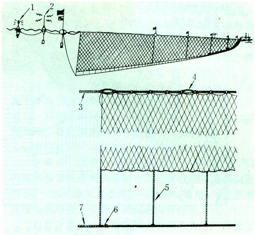 渔具 30年代日本流刺网材料为棉线,1954年后改用阿米纶(聚酰纤维的一种),1960年后已逐步被锦纶所代替。每片流刺网均由浮子纲、沉子纲、吊纲,缘网衣、主网衣、侧网衣等构成。每片网的浮子纲总长51.72米,装有56只塑料浮子,每只浮力225克;沉子纲总长50.84米,装有59个铅沉子,每个质量为75克;吊纲长为2.5米。网衣高度约5米,主网衣的网线为锦纶23特5×3、直径0.83毫米。母船式流刺网网目长度为121毫米或130毫米,基地式流刺网为110毫米。浮、沉子纲的网衣缩结系数分别为0.60~0.61和0.59~0.60。一船的网具敷设总长度可达10~15千米(图1)。美国和加拿大使用的网具分漂流和定置两种,流刺网的结构基本上与日本的相似,最大的差异是没有吊纲绳,每片网衣长度为17.5米,网目长度一般为121毫米,网衣高度为28目、45目和75目三种,因在近海作业,网具敷设长度为262.5~350米。定置刺网除了网具两端用锚固定外,其他和漂流刺网相同。