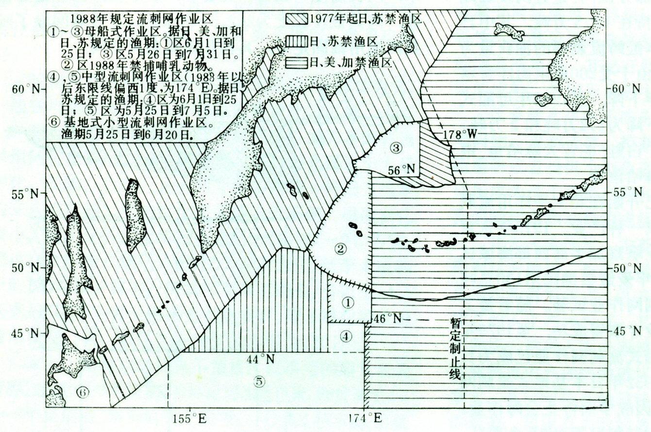 渔场 鲑鳟为冷水性鱼类,生活周期4~6年,其中在海上生活1~3年。其幼鱼大体上每年3~7月间离开河流入海,并沿着海流洄游。适温范围因鱼种而异,白鲑为0~2℃至9℃,红大麻哈鱼为3~7℃,鳟为4~11℃。鲑鳟主要分布于40°N以北的北太平洋中央亚寒带海流水域。太平洋东侧的渔场在美国加利福尼亚州沿海至阿拉斯加西部海域,太平洋西侧的渔场在日本海、鄂霍次克海东、西部近海及千岛群岛附近海区。作业渔场由于受到日、苏和日、美、加渔业协定的限制,母船式作业区仅限于46°N以北的太平洋海区,基地式中型和小型流刺网作业区分别在174°E以西、46°N以南的区域及153°E以西、44°N以南的区域。日本海中小型流刺网作业区域在37°N以北到46°N以南的日本海海区(图2)。