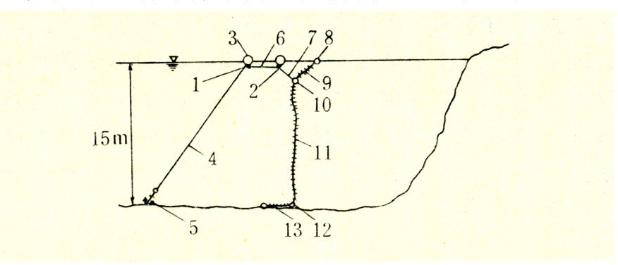 悬垂网围式 自浮在水面的钢丝绳向下垂吊合成纤维网围拦成的网围。这种网围应设在岩石少、锚容易抓牢,水深为15~20米的地方。通常在湾口采用直线形网围,在海岸线弯曲的地方采用拱形网围。日本家岛悬垂式网围养鱼场的网围布网方法见图1。在用浮筒浮起的浮体上平行设置两根钢丝绳。在钢丝绳上装有4~5米宽的返回网,在返回网下端的侧纲上悬挂网衣,侧纲用吊绳与浮筒相连接。在网围线的内侧或外侧,用锚绳将浮体系留在铁锚或混凝土块上。