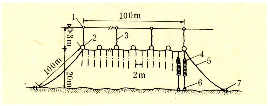 单绠浮筏 在中国南方亦称作软架子。可以设置在浅海及风浪较大的海湾或外海,用于扇贝、贻贝以及海带和裙带菜等的养殖。其基本结构是在一条直径约20毫米的聚乙烯浮绠上固定若干浮子,浮子用直径25厘米的塑料球,可产生浮力12.5千克。浮绠上系以吊绳,用于垂挂附有苗种的苗绳和网笼,浮绠的两头通过两根锚绳或橛绳系在固定于海底的锚、木橛或石砣上。石砣的大小要根据养殖海区风浪、水流的大小而定。常用石砣约100千克。浮绠长度即筏身长,通常为60米。一般海区,锚绳长度取大潮满潮时水深的2倍;风浪大而水流急的海区,要取水深的3倍。加长锚绳可防止大风浪时拔橛或石砣移位。单绠浮筏虽然可以用调节锚绳长度的方法来解决因潮汐而产生的海水上升时的压力问题,但在潮差和风浪过大的海区往往因受力过大,出现浮筏颠簸,影响生产和产量。为解决这一问题,日本设计了一种延绳式潜筏,采用少量大浮子吊浮绠,下面通过小浮子水平系一干纲,干纲下垂挂吊绳,整个筏悬吊在海水中层,成一柔性结构。这种中层延绳式潜筏在日本陆奥湾用于养殖扇贝(图3)。